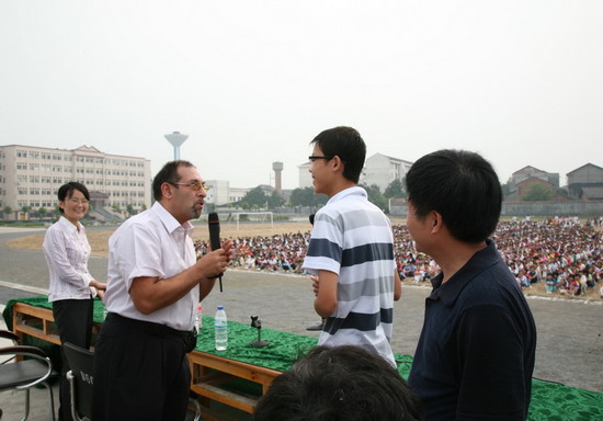 报告会在学校运动场举行。报告会互动性很强,学生走上台来与欧文先生和外籍教师提问、交流。欧文先生以自己的亲身经历介绍成功英语的学习方法,启发学生学好英语、具备双语能力,应对国家改革开放迅猛发展的形势,为国效力,创造自己崭新的人生。外籍教师则以他们独特的视角阐释双语学习的重要性。