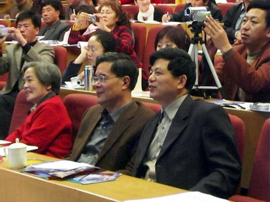 研讨会。前排左起:人教社英语教材总编刘道义教授(女)、中央教科所张志远教授。 |