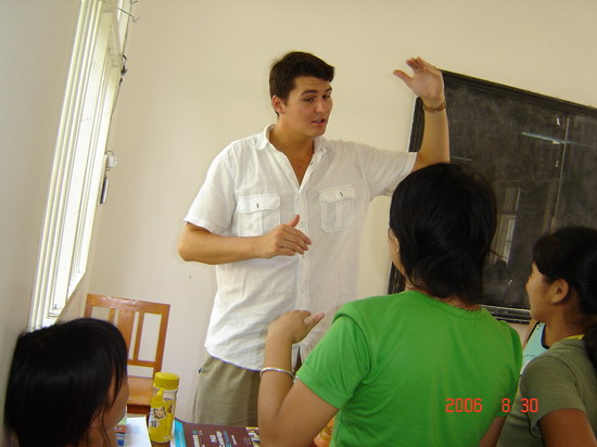 在培训地借班试教,在实践尝试中熟悉教中国学生的方法,外教很是投入。